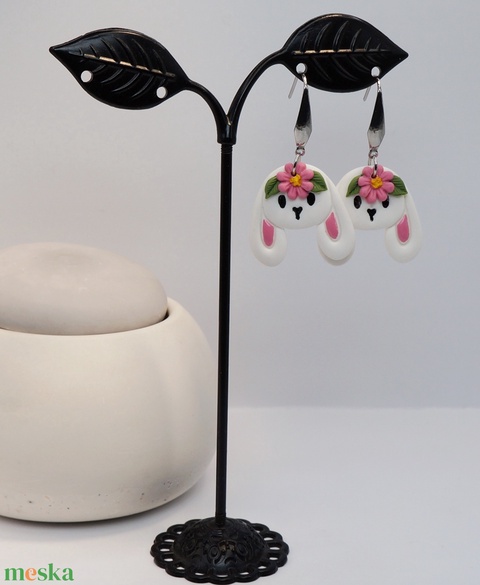 Rózsaszín virágos fehér nyuszi fülbevaló