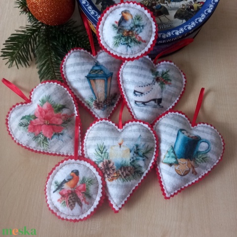 Vintage mintás karácsonyfa díszek, ajándékkísérők 7 db