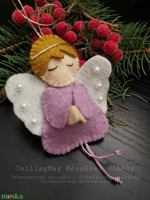 LILARUHÁS GYAPJÚFILC ANGYALKA/KARÁCSONYI DEKORÁCIÓ természetes anyagokból(gyapjúfilc,gyapjú),fehér gyönggyel,aranyzsinór