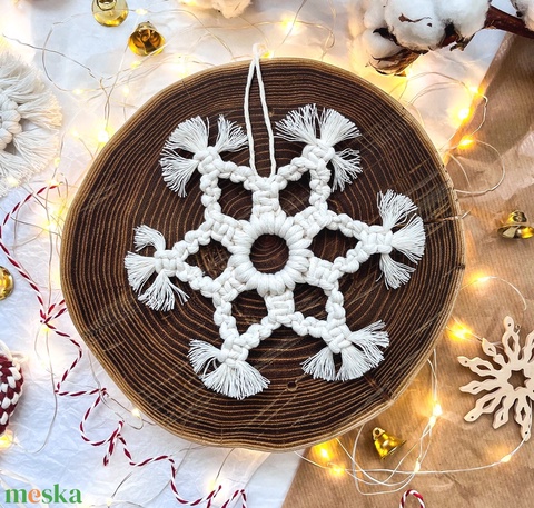 Makramé hópehely karácsonyi dísz, ünnepi dekoráció, natúr-fehér vagy csillogó natúr-arany fonalból
