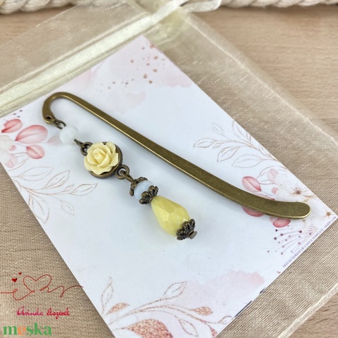 Krém apró rózsa könyvjelző antik bronz alappal fehér gyöngyel cseppel