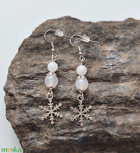 ezüst színű hópehely, nikkelmentes fülbevaló alap, szilikon fülbevalóvég, hópihe medál, fehér achát, akvamarin, ásvány