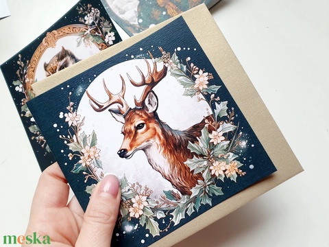 Szarvasos, vintage, kinyitható Karácsonyi Képeslap, Állatos, szarvas, Adventi lap, 13.5x13.5 cm borítékkal, négyzet