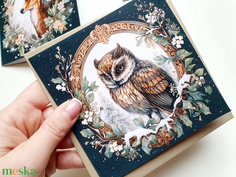 Bagoly, vintage, kinyitható Karácsonyi Képeslap, Állatos, madaras, Adventi lap, 13.5x13.5 cm borítékkal, négyzet