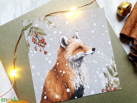 Rókás, Karácsonyi Képeslap, Állatos, róka, Adventi lap, kinyithatós képeslap, 13.5x13.5 cm borítékkal, négyzet