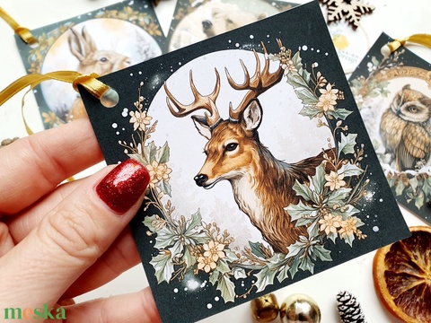 4db, Karácsonyi ajándékkísérő, kísérő kártya, 6x6 cm, lyukasztva, szalaggal