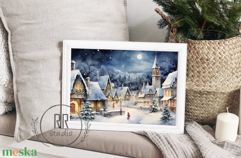 Hangulatos Téli táj, havas házak, karácsonyi város, karácsonyi falikép, print, kép