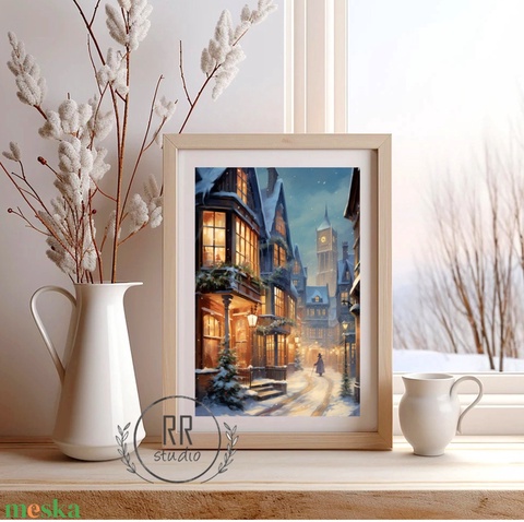 Hangulatos Téli táj, havas házak, karácsonyi város, karácsonyi falikép, print, kép