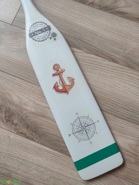 Nagyméretű fa evező dekoráció, türkiz és napsárga színekkel. :-)