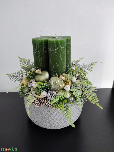 - Anyaga: betonkaspó, tűzőhab, gyertya, műzöldek, termések, üveggömb, bogyó, zuzmó