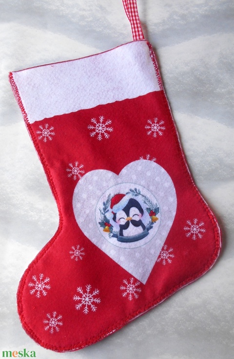 Mikulás csizma pingvines (piros-fehér hópelyhes)