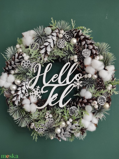 szalmakoszorú, műzöldek, toboz, bogyó, üveggömb, gyapottvirág, zuzmó, hellotélfelirat