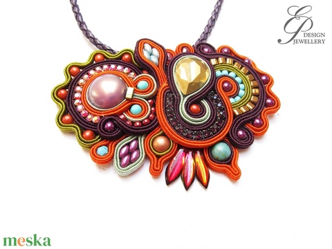 - Anyaga: sujtászsinór, cseh csiszolt gyöngyök, bőr, japán kása, strasszlánc, japán kockagyöngy, üvegkaboson, cseh dárdagyöngy