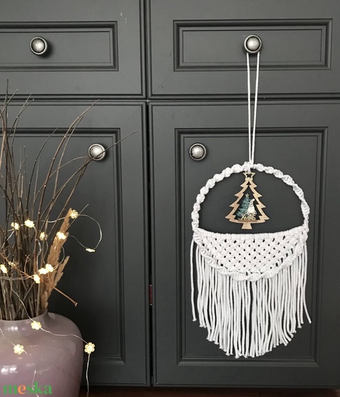 makramé ajtódísz, fehér cuki kis karácsonyi dísszel