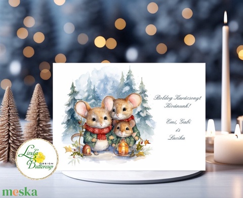 Karácsonyi egér család, Karácsonyi Képeslap, névre szóló, aláírással, kinyithatós képeslap A6 méret borítékkal, egeres