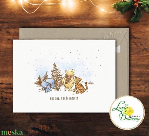Karácsonyi Képeslap, Micimackó, Retro, Adventi Kártya, Vintage Karácsonyi üdvözlőlap, Ünnepi lap, Antik, régi