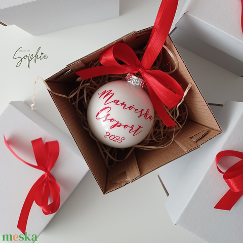 6 cm-es üveg karácsonyi gömbök egyedi felirattal.