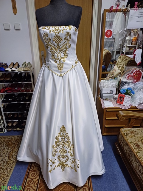 Menyasszonyi palotás ruha, báli, szalagavatós ruha, arany zsinórozással, füzős.