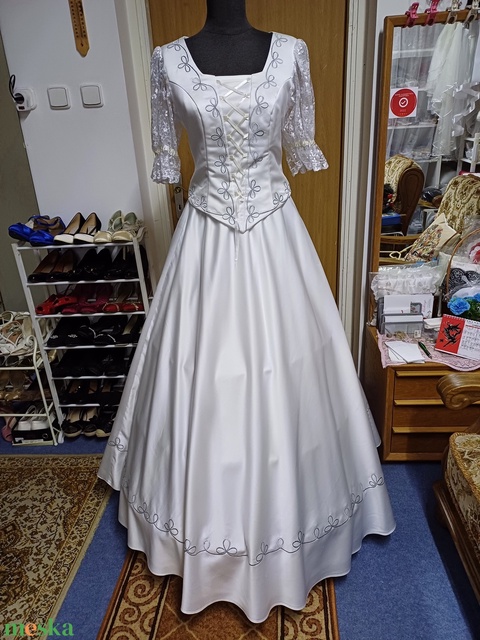 Menyasszonyi, báli, szalagavatós palotás ruha, ezüst zsinóros.