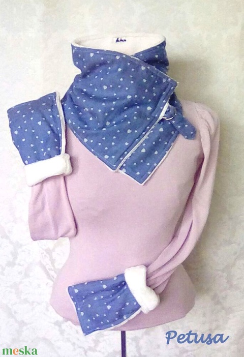 Sál kesztyű szett kék, farmer hatású, fehér szívekkel Körsál Nyakmelegítő