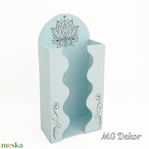 - Anyaga: zsebkendőtartó, alapozó, akrilfesték, transzferoldat, lakk