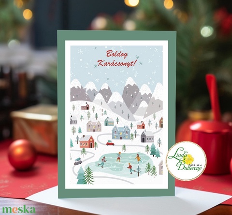 Karácsonyi Képeslap, karácsonyi üdvözlőlap, ünnepi képeslap, korcsolyázó emberek, havas, téli táj