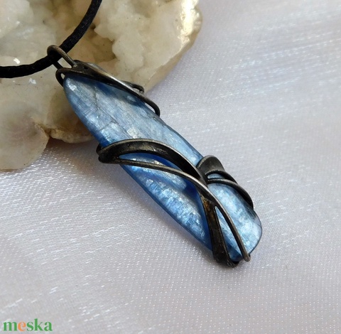 A medál Tiffany technikával készült kianit (disztén) és ólommentes, ezüsttartalmú ón felhasználásával. A díszítés szintén saját készítésű, nem tartalmaz gyári elemeket. A fémrészt óezüstre patináztam és lelakkoztam, hogy sokáig szép maradjon.
