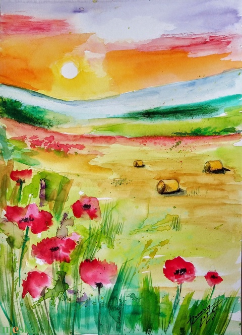 "Pipacsos augusztus" akvarell festmény, Magyarország