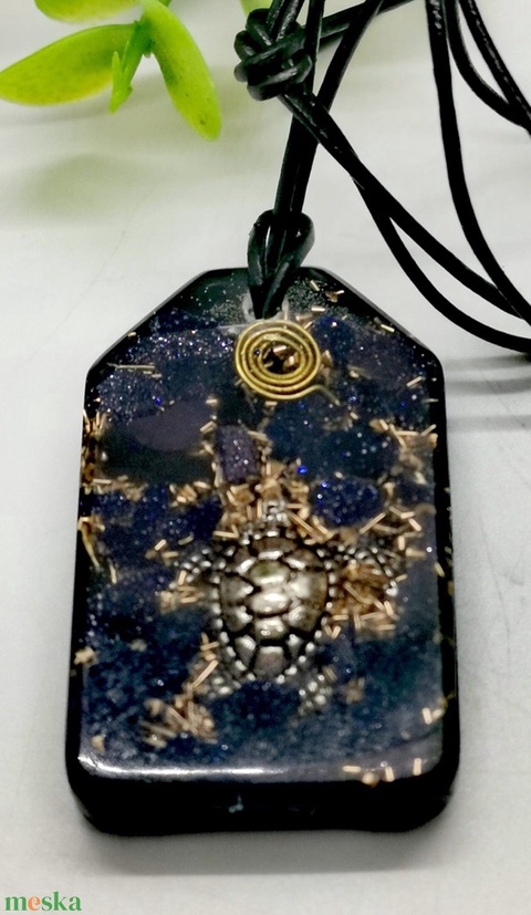 Szögletes Orgonit-sungit medál fém teknőccel, kék homokkővel bronzforgáccsal,rézspirállal