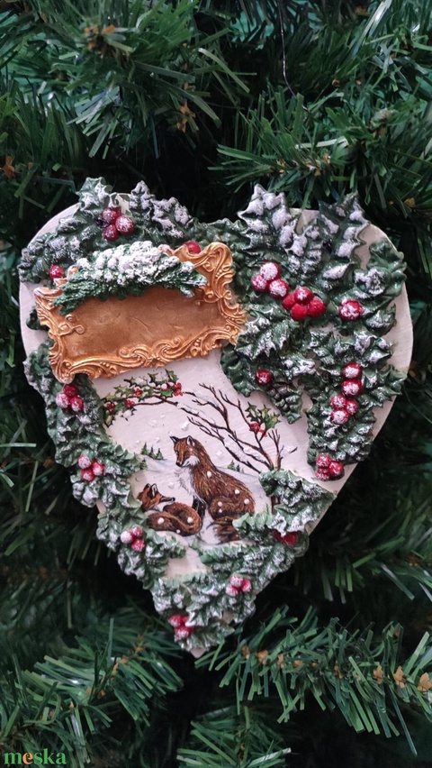 Karácsonyi szív alakú akasztós dísz rókákkal