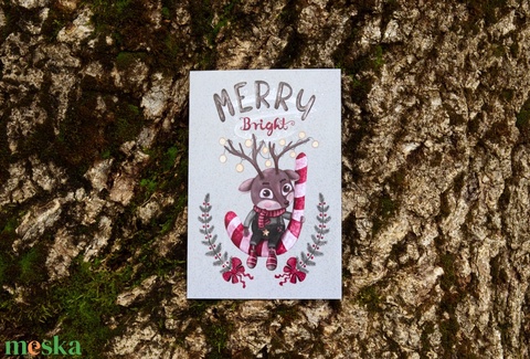 Karácsonyi képeslap - Kicsi szarvaska cukorkával és égősorral, hátulján kedves angol szöveggel