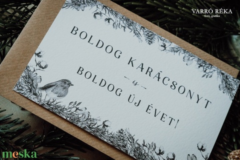 Madár fenyővel karácsonyi képeslap - szürkemintával