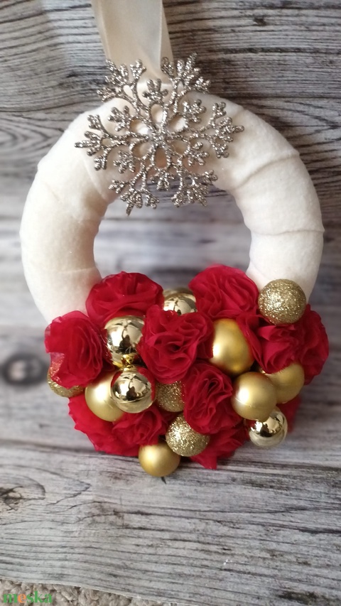 Karácsonyi kopogtató hópihével, ajtódísz, piros és arany