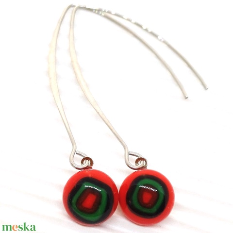 NEMESACÉL - Piros örvény üveg millefiori pötty fülbevaló hosszú, design akasztón, üvegékszer