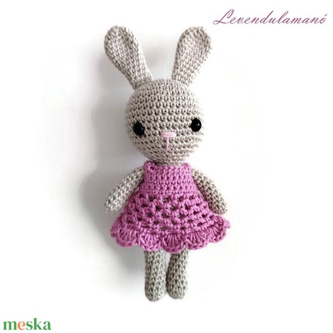 Horgolt szürke nyuszilány mályva színű ruhában amigurumi