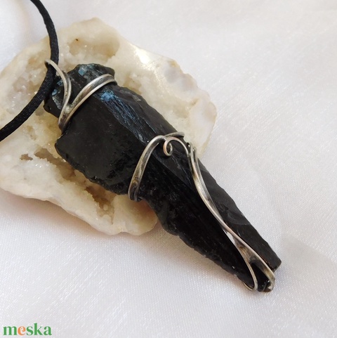 A medál Tiffany technikával készült fekete obszidián és ólommentes, ezüsttartalmú ón felhasználásával. A díszítés szintén saját készítésű, nem tartalmaz gyári elemeket. A fémrészt óezüstre patináztam és lelakkoztam, hogy sokáig szép maradjon.