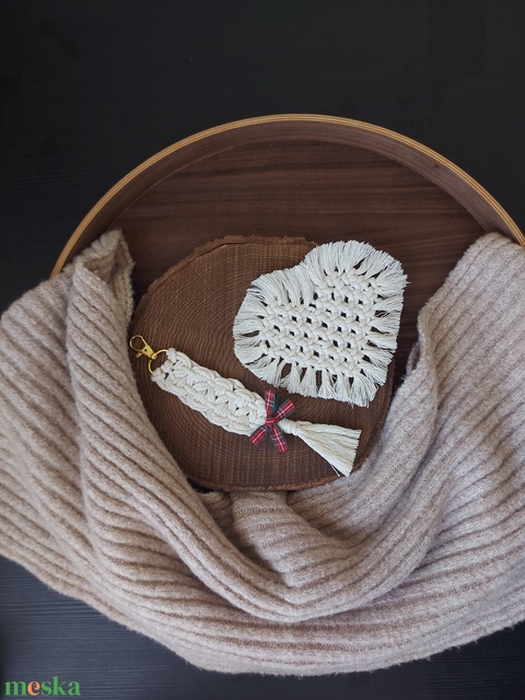 Szív alakú poháralátét és kulcstartó ajándékcsomag, szett - fehér, makramé
