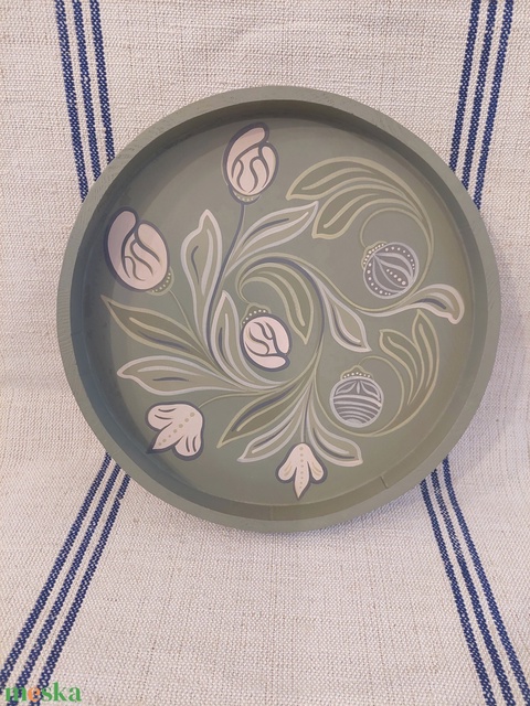 Kézzel festett peremes tálca- dísztálca- asztalközép- zsályazöld