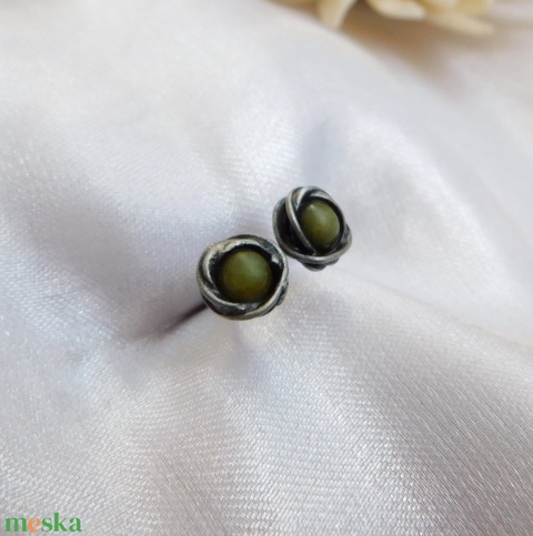 A fülbevaló tiffany technikával készült nefrit jáde gyöngyök, réz és ólommentes, ezüsttartalmú ón felhasználásával. A díszítés szintén saját készítésű, nem tartalmaz gyári elemeket. A díszítés szintén saját készítésű, nem tartalmaz gyári elemeket.A fémrészt óezüstre patináztam és lelakkoztam, hogy sokáig szép maradjon.