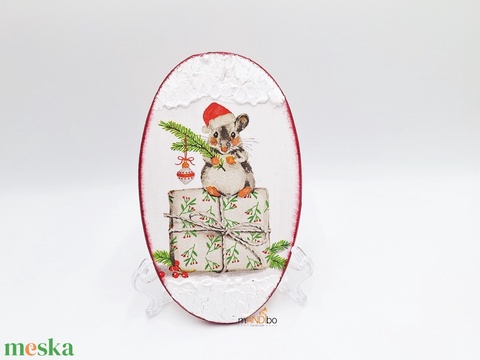 Karácsonyi óvális deszkakép dekoráció - Egérke ajándékdobozon