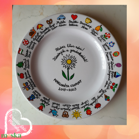 Évzáróra, ballagásra, nyugdíjas búcsúztatóra kedves ajándék a gyerekek nevével, óvodai jelével ellátott tányért ajándékozni.