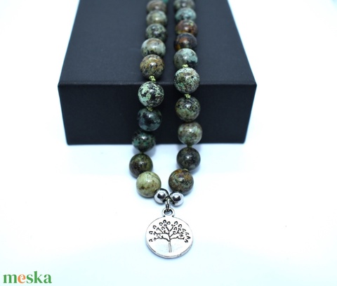 - Anyaga: 8-as méretű afrikai türkiz ásvány, beadcord, életfa, szerelőkarika, stopper, köztes elem, delfinkapocs, lánchosszabbító