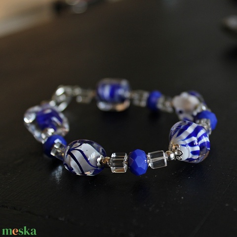 Kék fehér lámpagyöngy karkötő, klasszikus üveggyöngy karkötő, MURÁNÓI üveg ékszer, romantikus karkötő