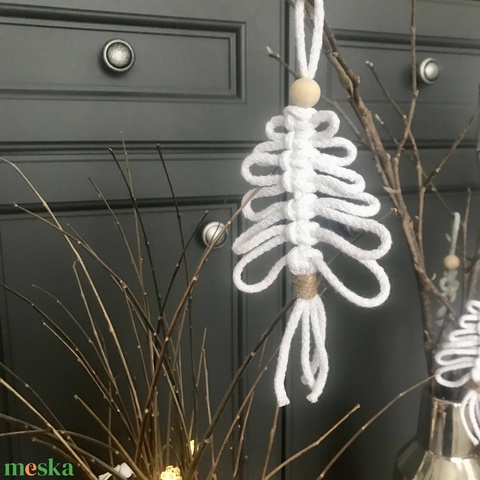 Karácsonyi dísz hófehér, enyhén csillogó makramé zsinórfonalból
