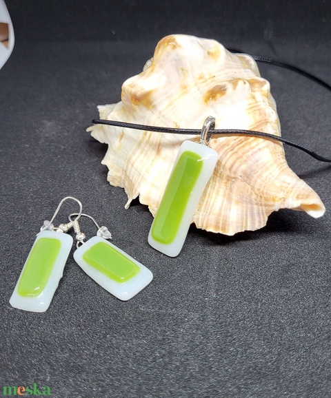 Fehér alapon almazöld mintás fusing üvegékszer szett