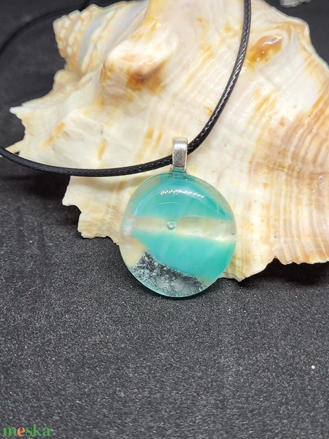 Türkiz áttetsző üveg medál, zsinór nyaklánccal