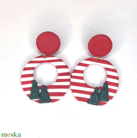 Piros és fehér csíkos, apró fenyőkkel díszített fülbevaló