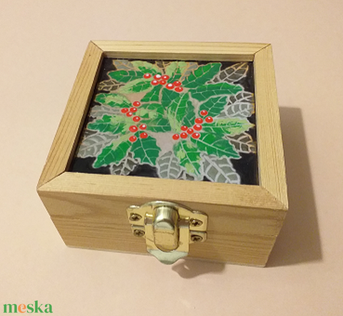 Tűzzománc fedőlappal díszített ékszerdoboz - magyal ágakkal
