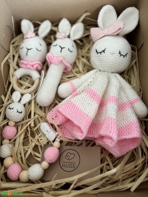 Nyuszis baba szett, babaváró ajándék (csörgő, cumilánc, nyunyóka)