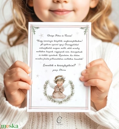 Keresztszülő felkérő kártya, angyalkás, téli ajándékkísérő